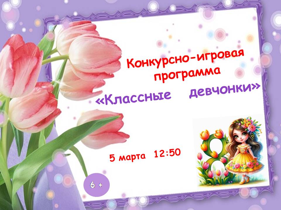 В преддверии этого весеннего праздника в детской библиотеке библиотечно-информационного центра имени Е. П. Смургиса пройдёт игровая программа «Классные девчонки».