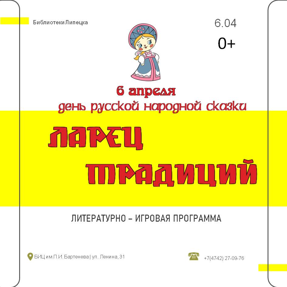 Приглашаем отметить День русской народной сказки – праздник, посвящённый богатой и удивительной традиции русской народной культуры. Мудрая сказительница расскажет о том, когда появилась сказка на Руси, кем были первые сказочники и какие бывают виды сказок. А ещё участников ожидают сказочные состязания в увлекательной литературной викторине.